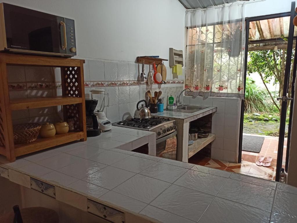The accommodation is located at Vía Los Bancos, Mindo, Ecuador.